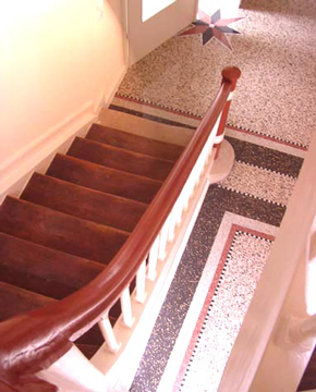 Es wurden besonderen Wert auf die Erhaltung der Gebäude spezifischen Elementen gelegt, so wurde der wunderschöne Terrazzobelag im Eingans-Flurbereich, sowie die Etagentreppe aus Eiche freigelegt und aufwendig aufgearbeitet.